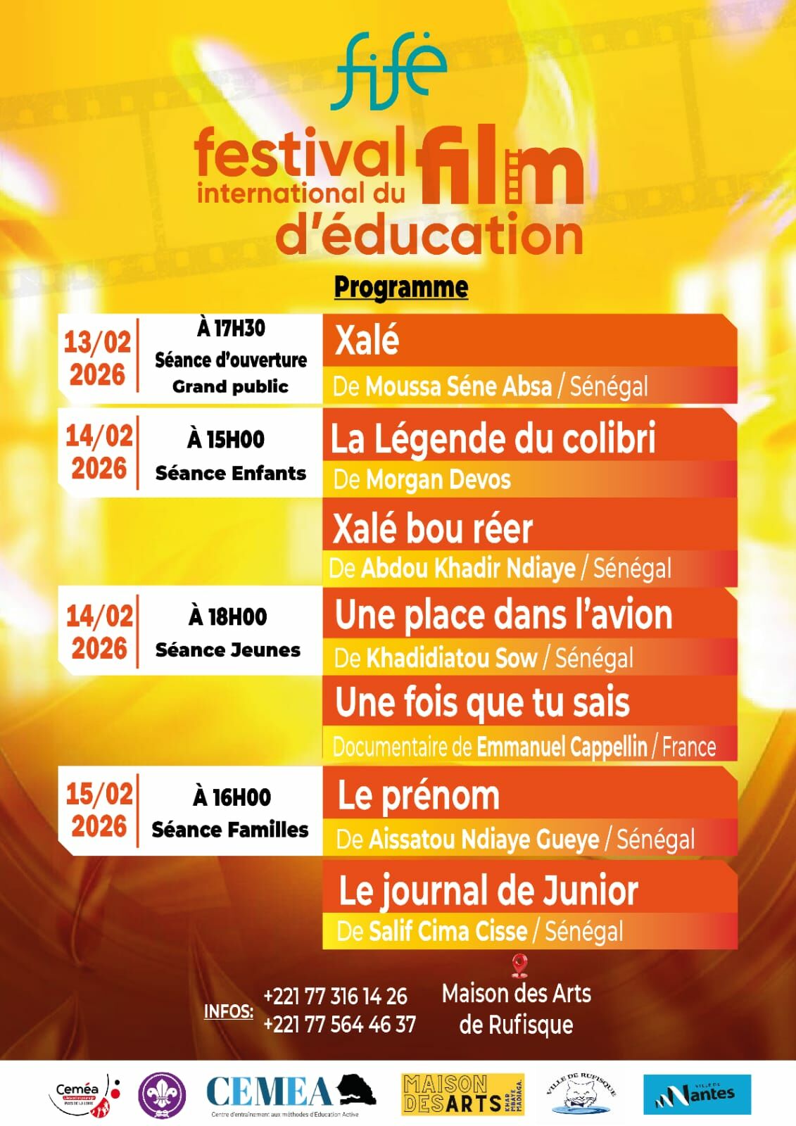 Cette édition aura lieu du 13 au 15 février 2026, elle est organisée par les Ceméa Pays de la Loire et la Maison des Arts de Rufisque, avec le soutien des Villes de Rufisque et de Nantes, ainsi que des Ceméa du Sénégal.