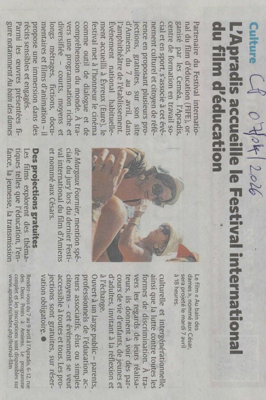 Dans le cadre de la délocalisation du Festival International du Film d’Éducation (FIFE) d’Évreux, l’Apradis en partenariat avec les Ceméa de Picardie ont le plaisir d’organiser plusieurs projections sur leur site d’Amiens, du 7 au 9 avril.